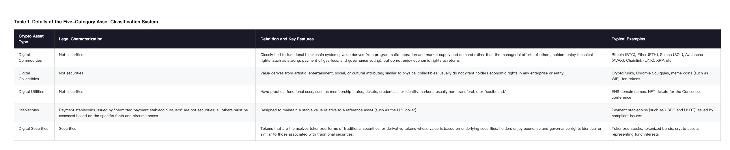 For the U.S. crypto market, the Guidance's most important contribution lies in the fact that it establishes a systematic classification framework for crypto assets. The framework divides crypto assets into five categories and defines the legal status of each category separately.